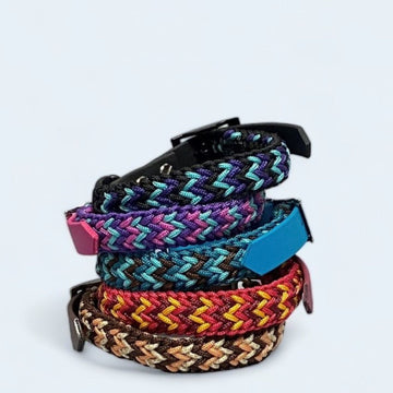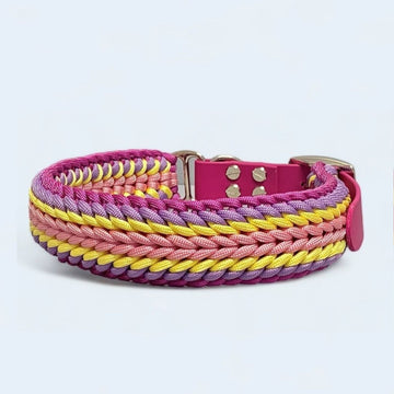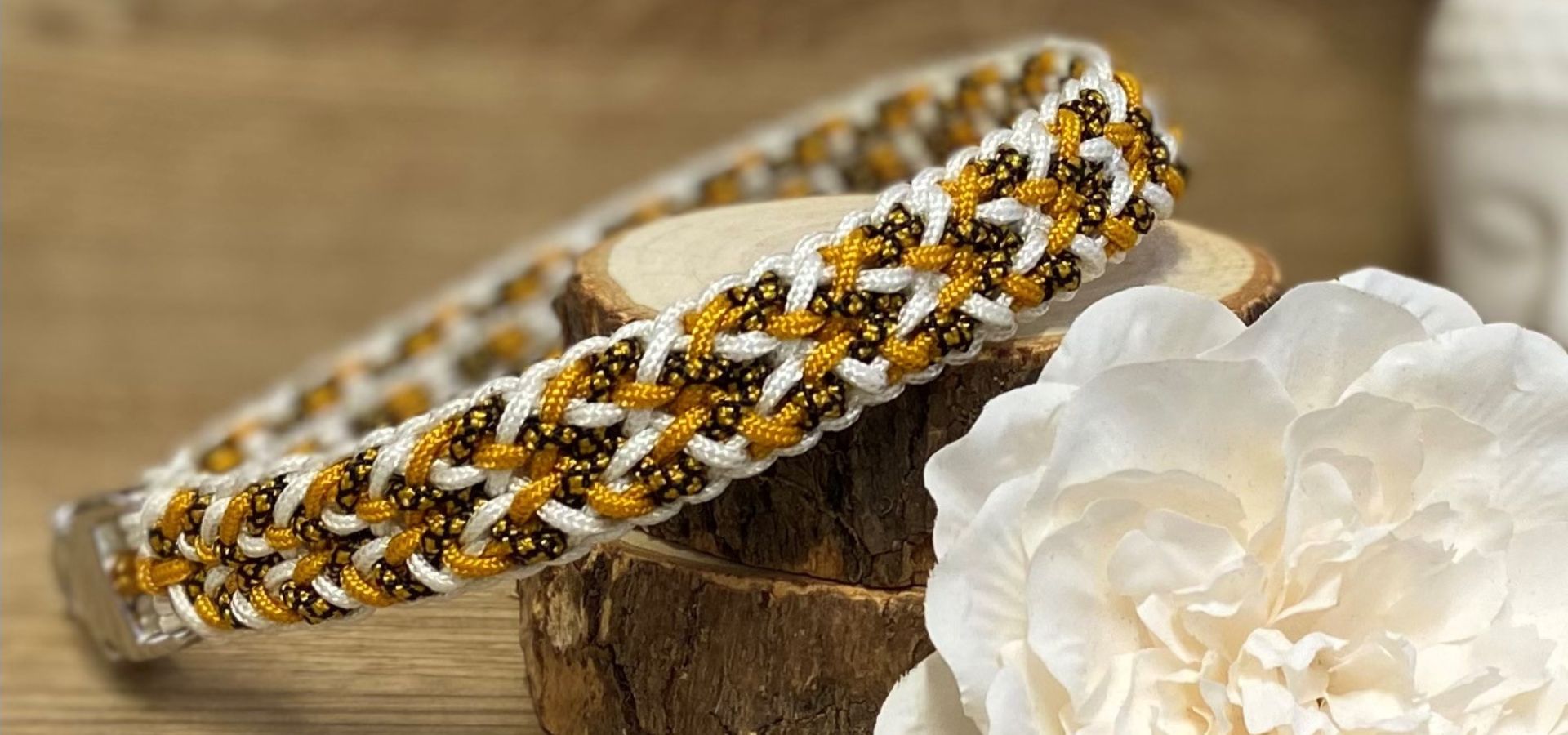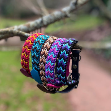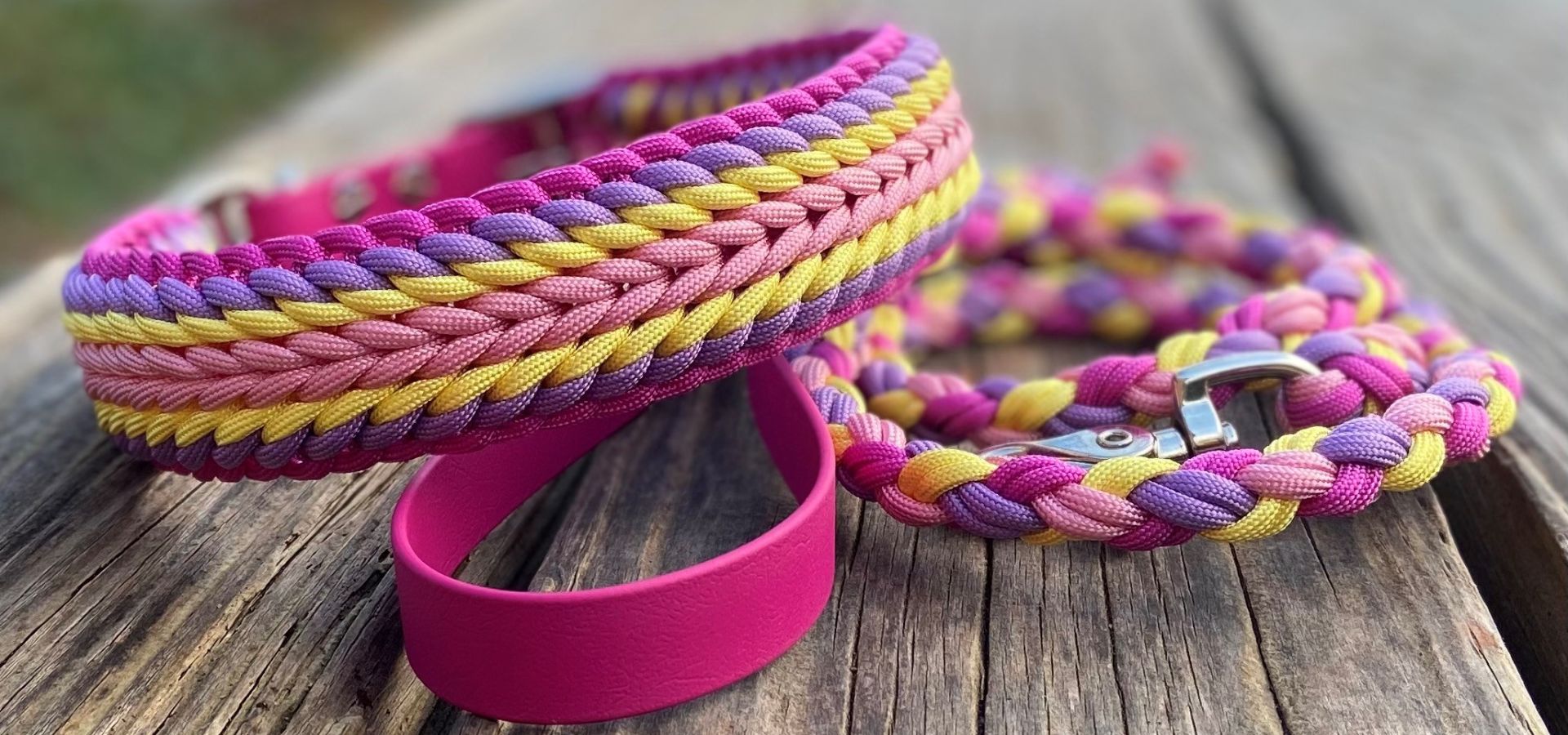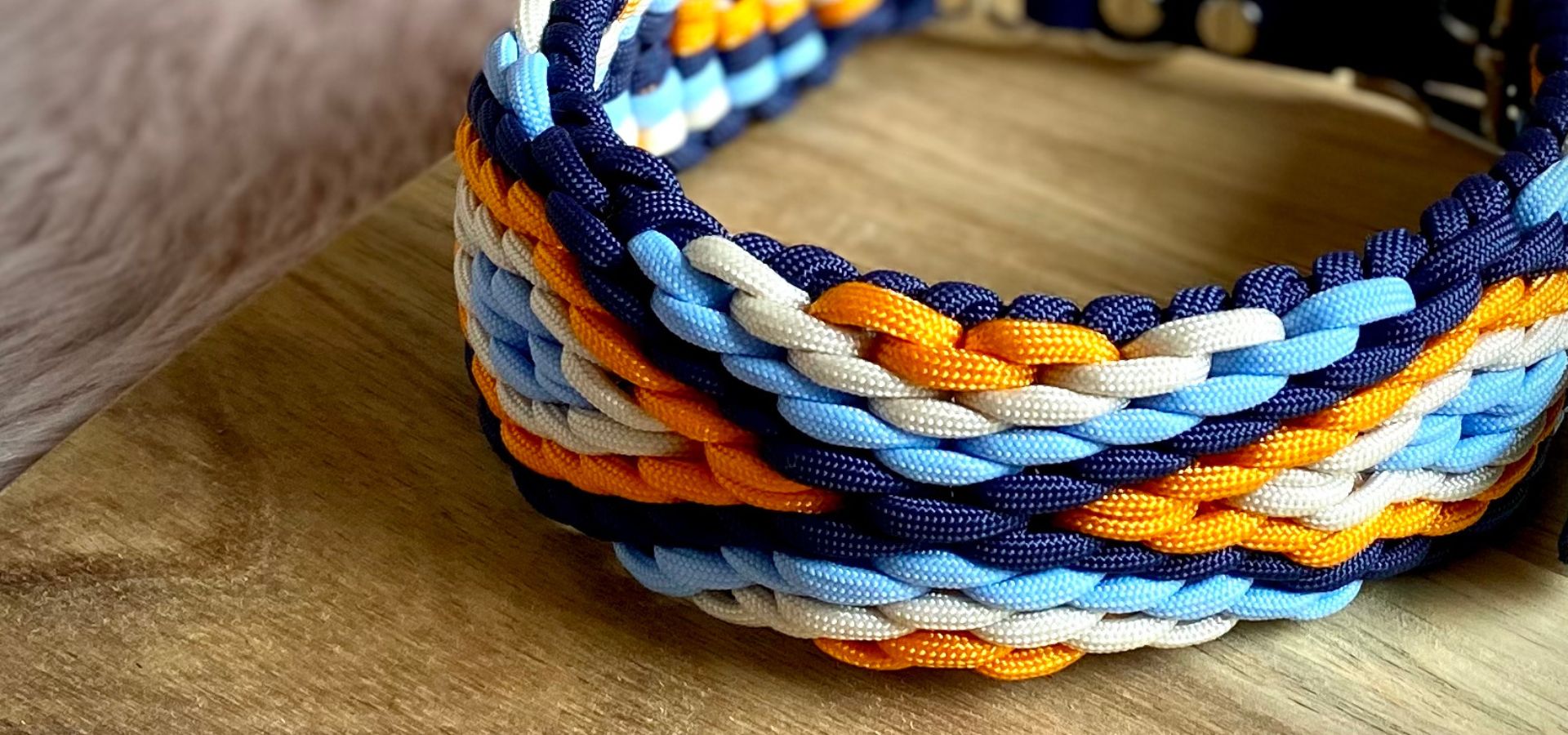 We specialise in creating unique, luxury dog collars, leads and accessories, each one lovingly handcrafted in our Devon studio. Strong and vibrant paracord is knotted and braided to create unique designs, certain to make your dog stand out in the pack.