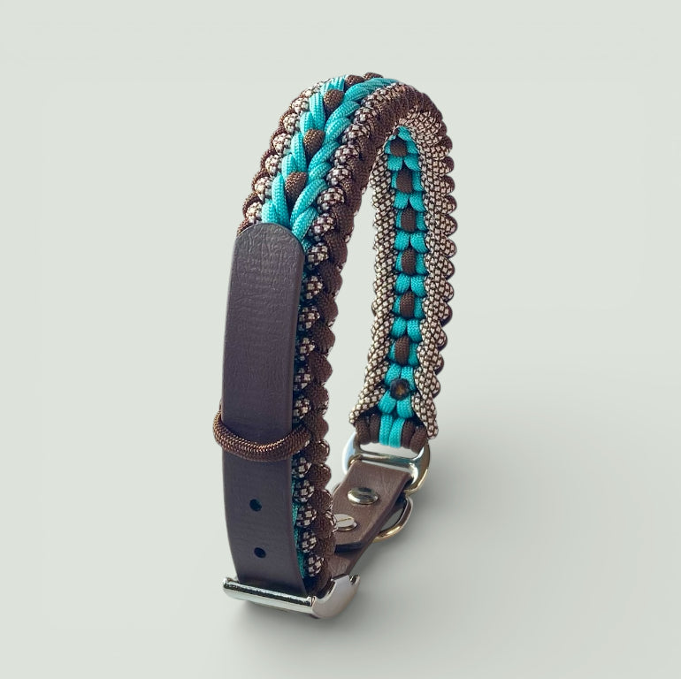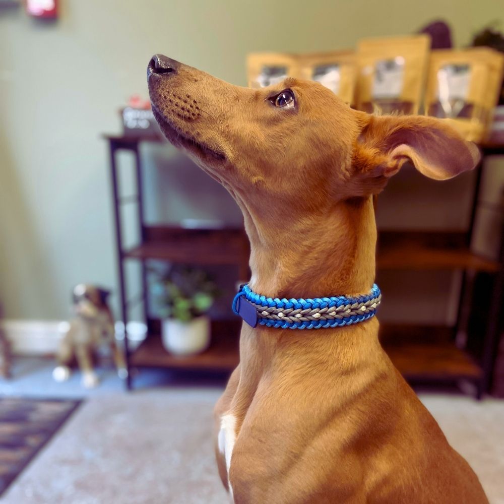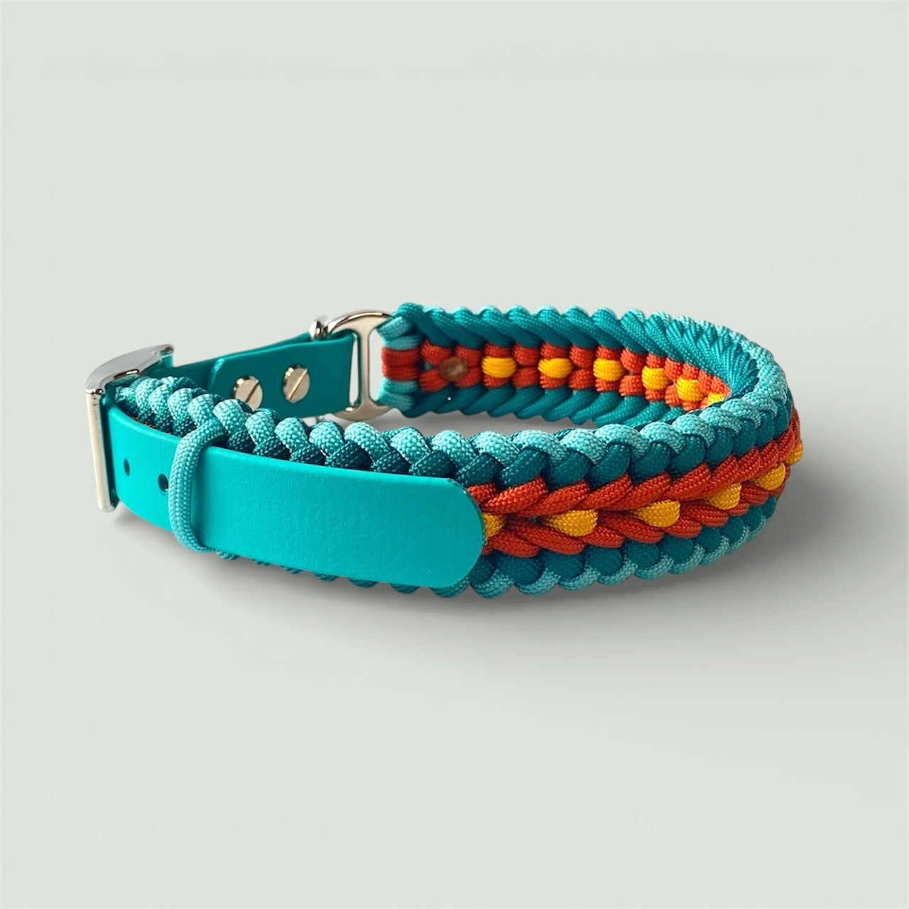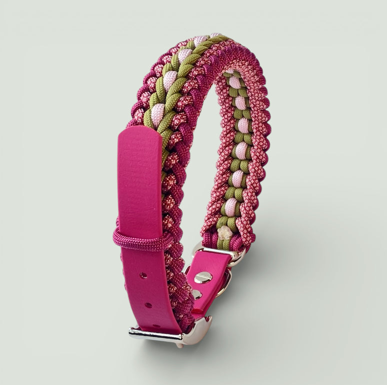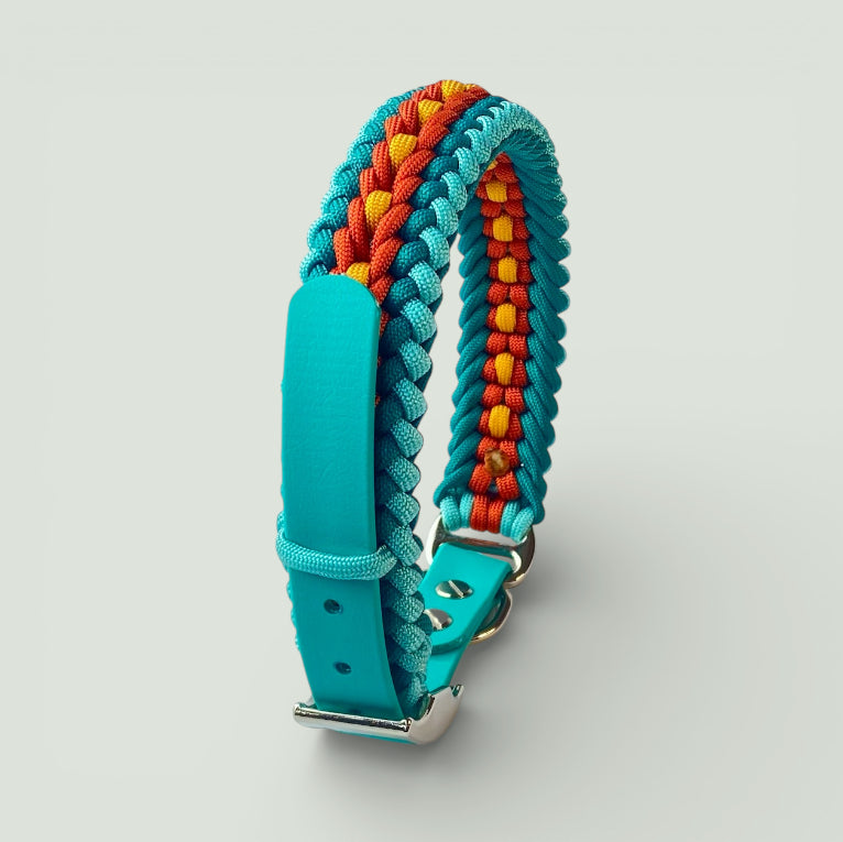 Every Big Green Hound collar is handcrafted to order in our Devon studio, ensuring quality, comfort and an accurate fit. The Cascade Narrow is tightly knotted using premium paracord for strength and flexibility, and each collar is finished with a complementary BioThane adapter and durable metal hardware.