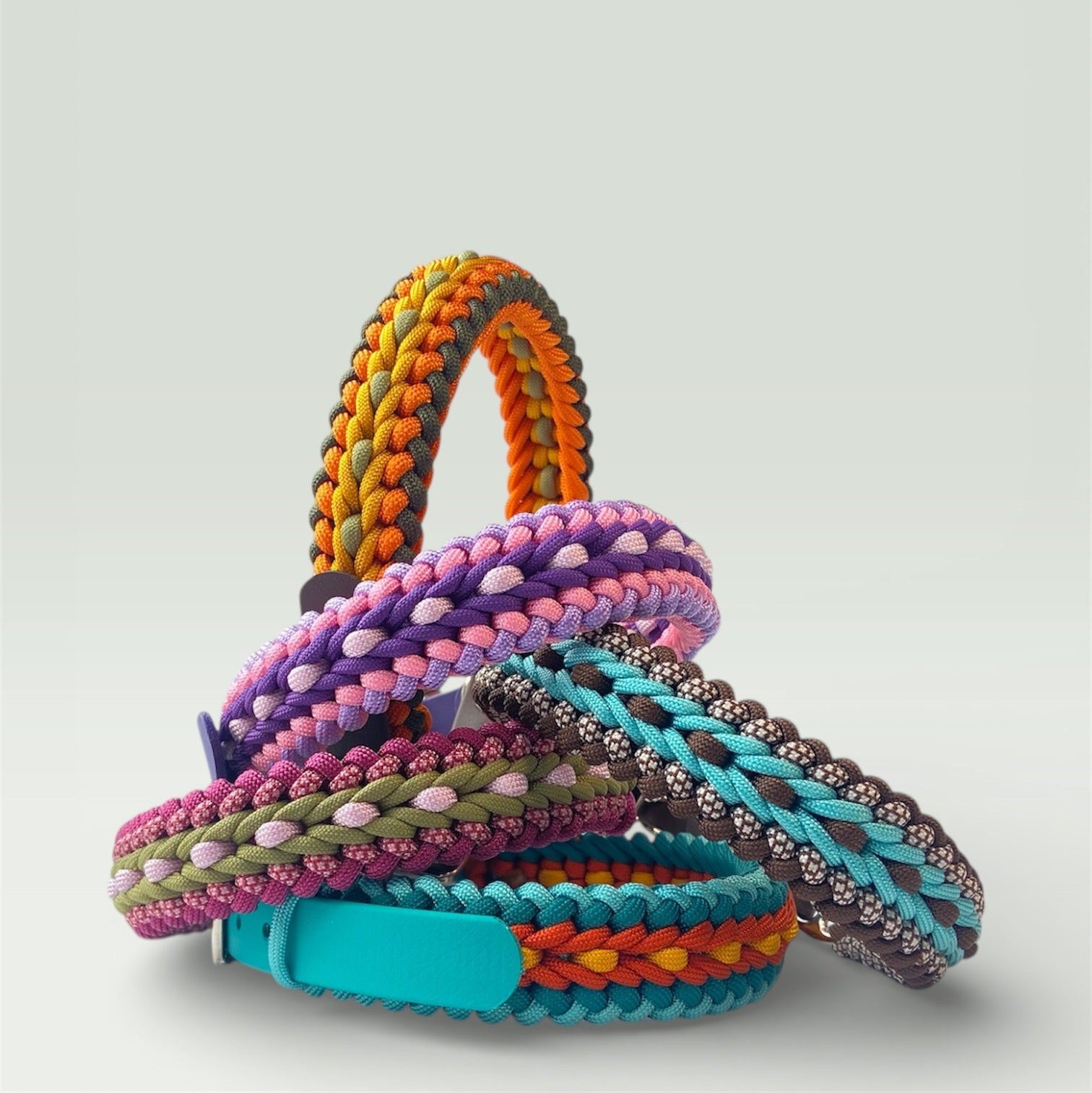Our Cascade Narrow offers a slimmer take on our original Cascade design, using fewer cords to create a refined profile without compromising on strength. Made from standard size paracord, it’s a robust, reliable choice for small through to large dogs, offering everyday durability with a lighter, neater look.